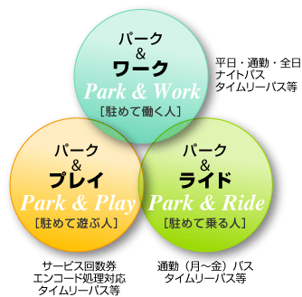 駐車場需要には主に、パークアンドワーク、パークアンドライド、パークアンドプレイの3つがあります。それぞれのカテゴリーを対象として、働く人の需要が多い駅前では平日・通勤定期を採用、遊ぶ人の需要が多い繁華街ではサービス回数券を併用するなど、マーケット、立地特性、規模に合わせてピンポイントに集客できる駐車商品を供給いたします。
